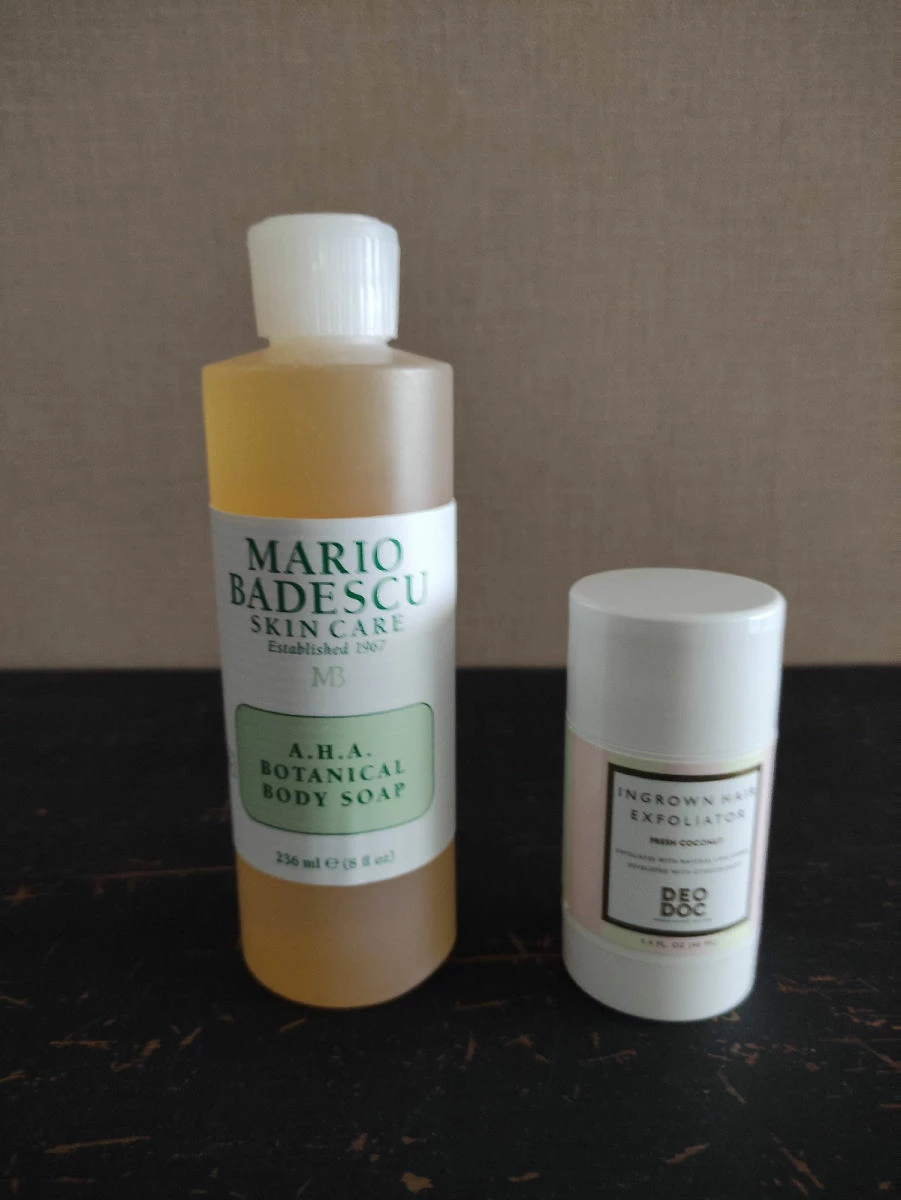 1) DeoDoc στικ απολεπισης που βοηθάει στην πρόληψη των τριχών που φυτρώνουν μετά την αποτρίχωση. Σχεδιασμένο με θρυμματισμενες φυσικές πέτρες λάβας που αφαιρούν απαλά τα νεκρά κύτταρα του δέρματος. Αυτό επιτρέπει στις τρίχες να διεισδύσουν στον φραγμό του δέρματος πιο εύκολα και να μην αναπτυχθούν προς τα μέσα. Πλούσιο σε μέταλλα και ενυδατικα συστατικά όπως η βιταμίνη Ε. Αναπτύχθηκε από γυναίκες ιατρούς και γυναικολόγους. 100% vegan . άρωμα καρύδας