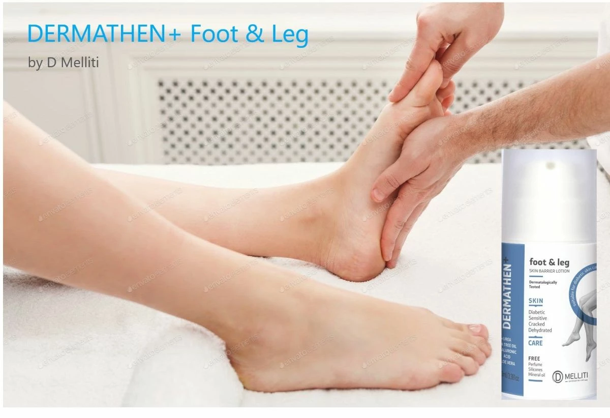 Vendora DERMATHEN+ Foot & Leg Skin Barrier Lotion. Ισχυρής ενυδάτωσης λοσιόν για την πρόληψη Διαβητικού ποδιού. Δερματολογικά ελεγμένη. Με συστατικά που μειώνουν το αίσθημα κνησμού και την κοκκινίλα .
