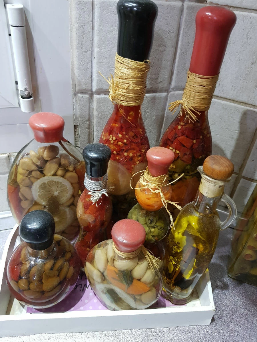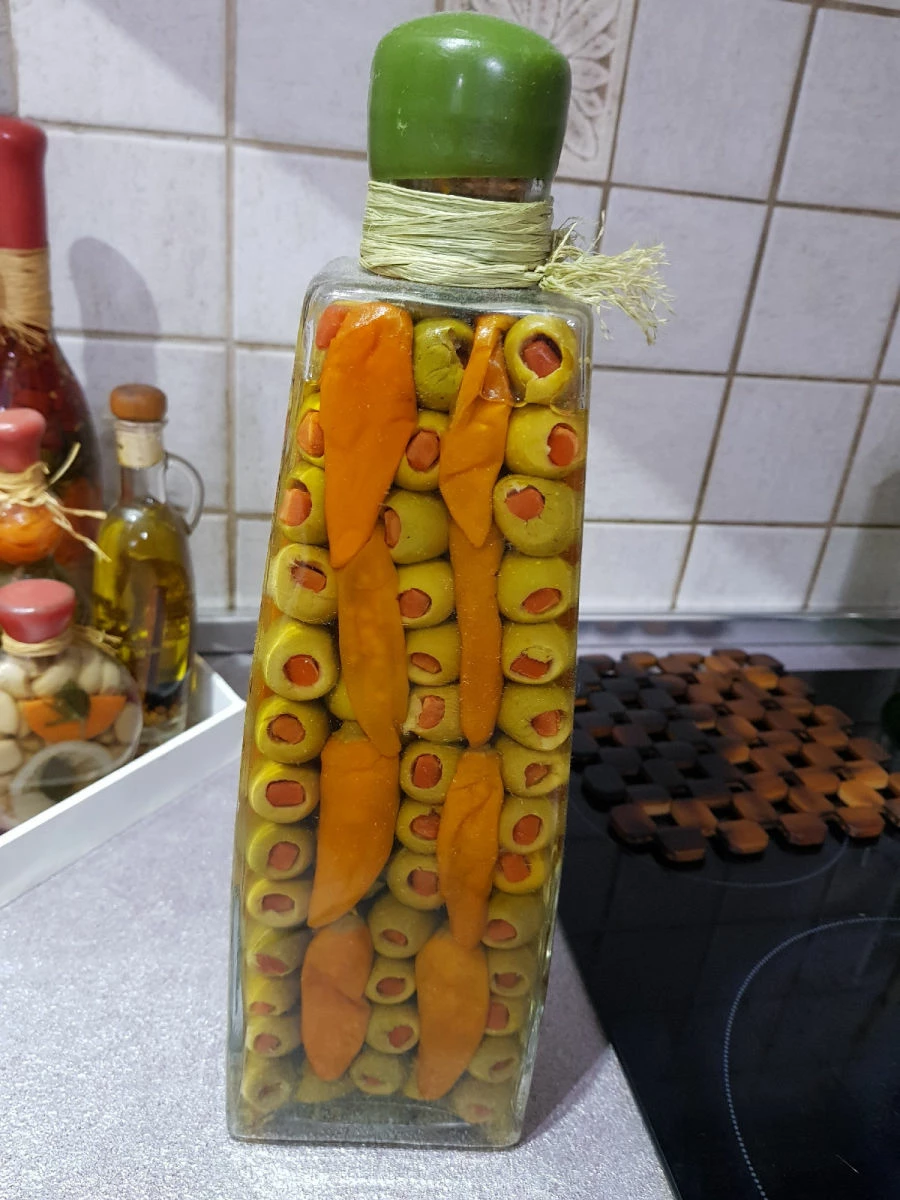 διάφορα μπουκάλια με πιπεριές ,ελιές διακοσμητικά κουζίνας