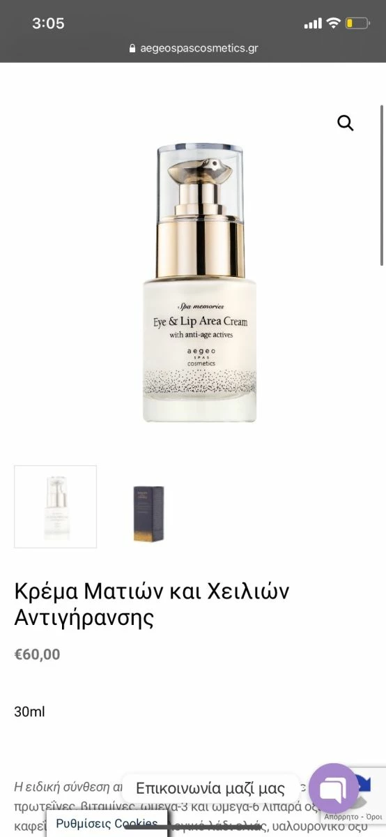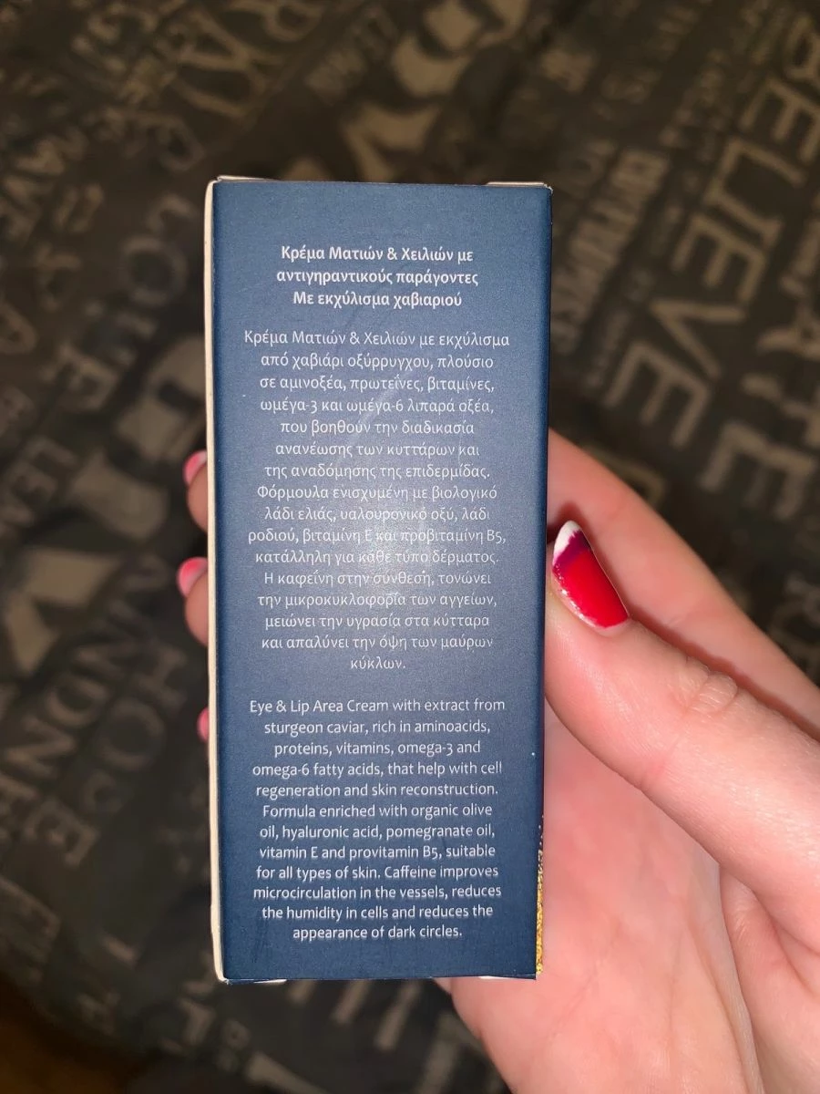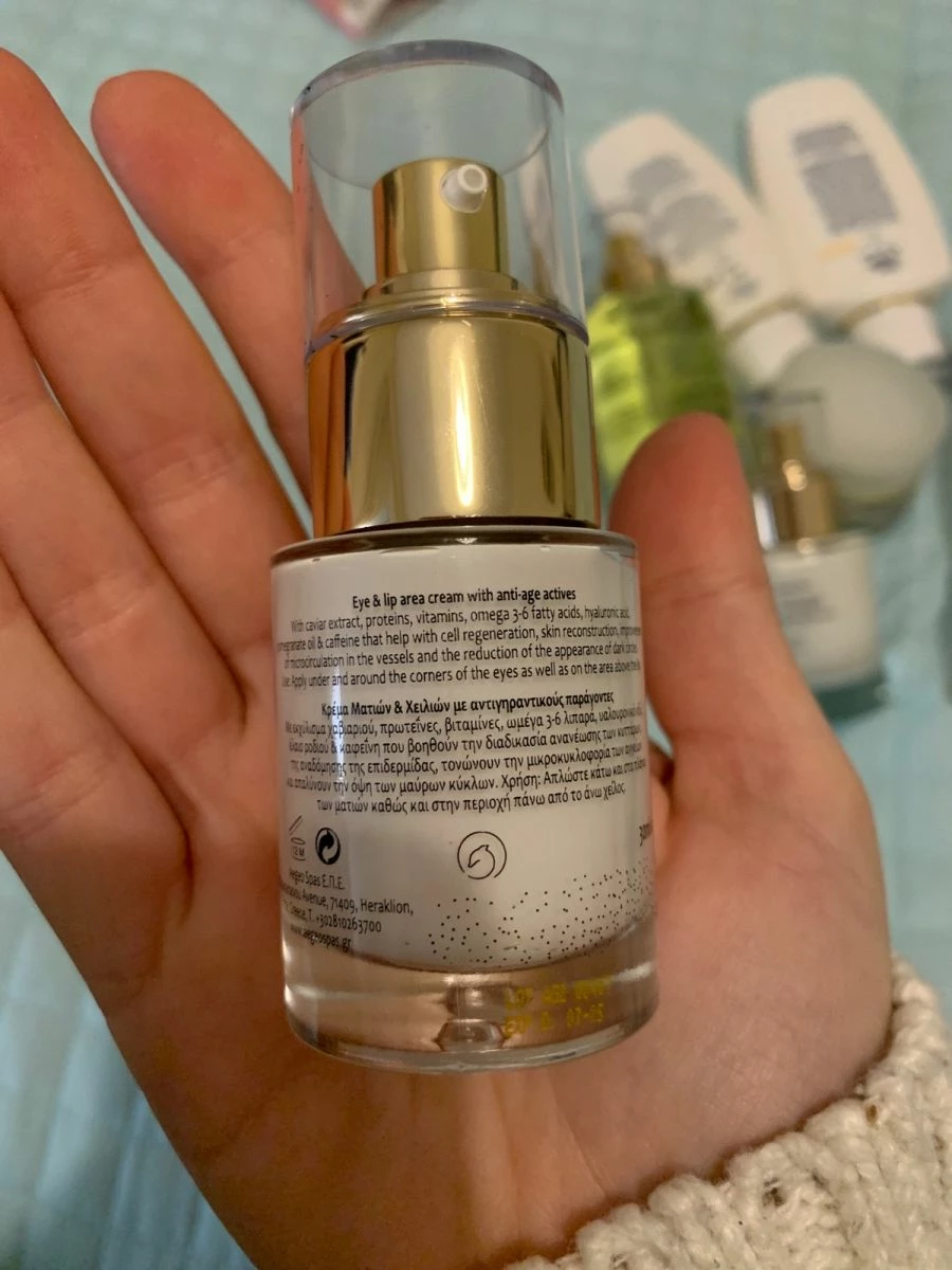 Το προϊόν ειναι άθικτο και αγορασμένο πριν λίγους μήνες. Η ποιότητα του ειναι εξεταστικη καθώς περιέχει χαβιάρι, βιταμίνες, πρωτεΐνες, ωμέγα 3-6, ΥΑΛΟΥΡΟΝΙΚΟ και διασφαλίζει τη σύσφιξη και την αναδόμηση επιδερμιδας στη περιοχή των ματιών.