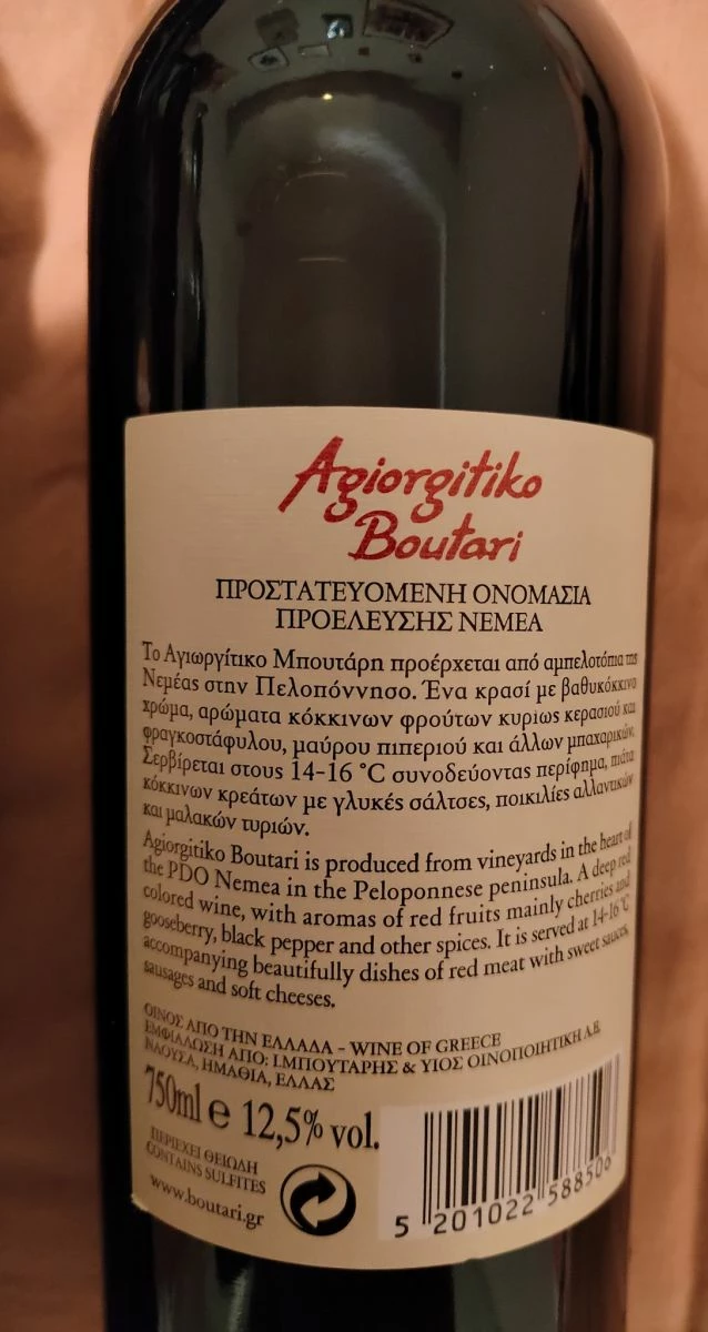 με διακριτικές γεύσεις μοσχοκάρυδου και κανέλας, μέτριας οξύτητας και μαλακές τανίνες. Η αγιωργίτικη ποικιλία συνδυάζεται υπέροχα με ψητά κρέατα, σάλτσες ντομάτας και καρυκευμένες κουζίνες από τη Μέση Ανατολή μέχρι την Ινδία. Σερβίρεται στους 15-20°C.