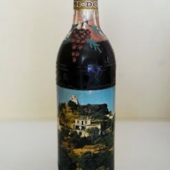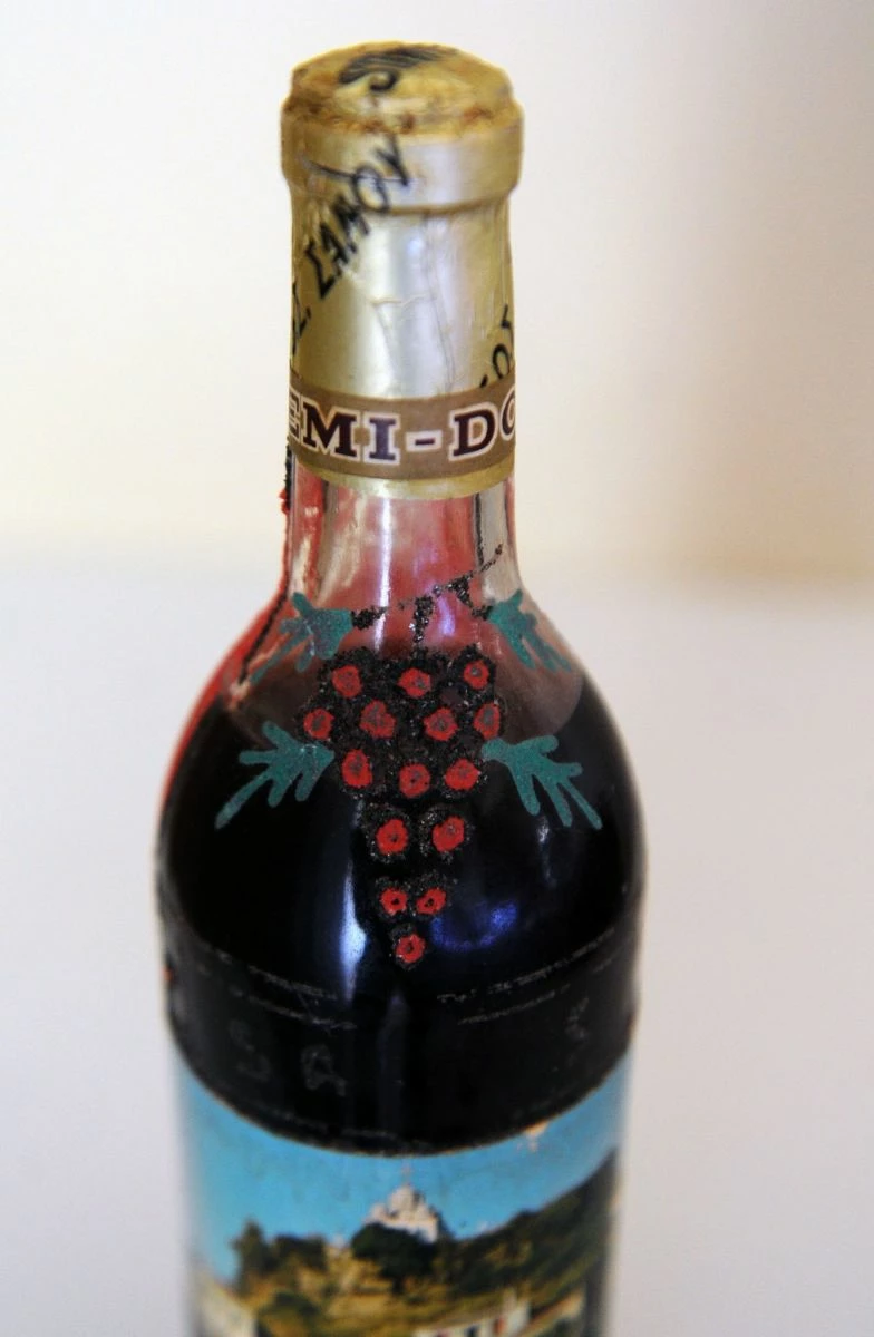 Το μπουκάλι με το ημίγλυκο κρασί Σάμου έχει ανάγλυφες λεπτομέρειες και το βάρος του είναι 1.230 γρ και το Υψος 30 εκ.