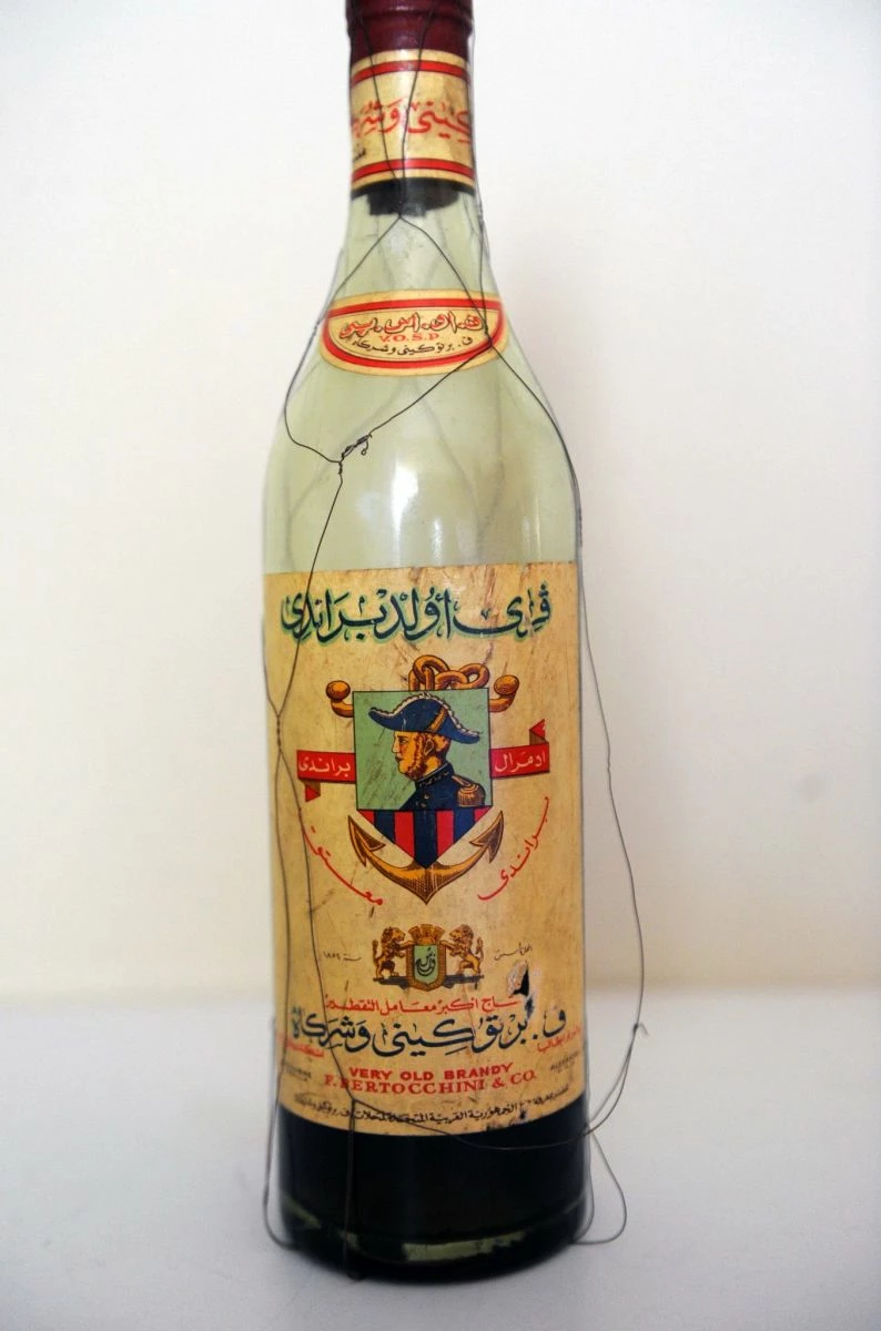 Το μπουκάλι με το μπράντι (επίσης σφραγισμένο και δεμένο με μεταλλικό σύρμα) γράφει «Very old brandy F. Bertocchini & co» και το βάρος του είναι 1.038 γρ