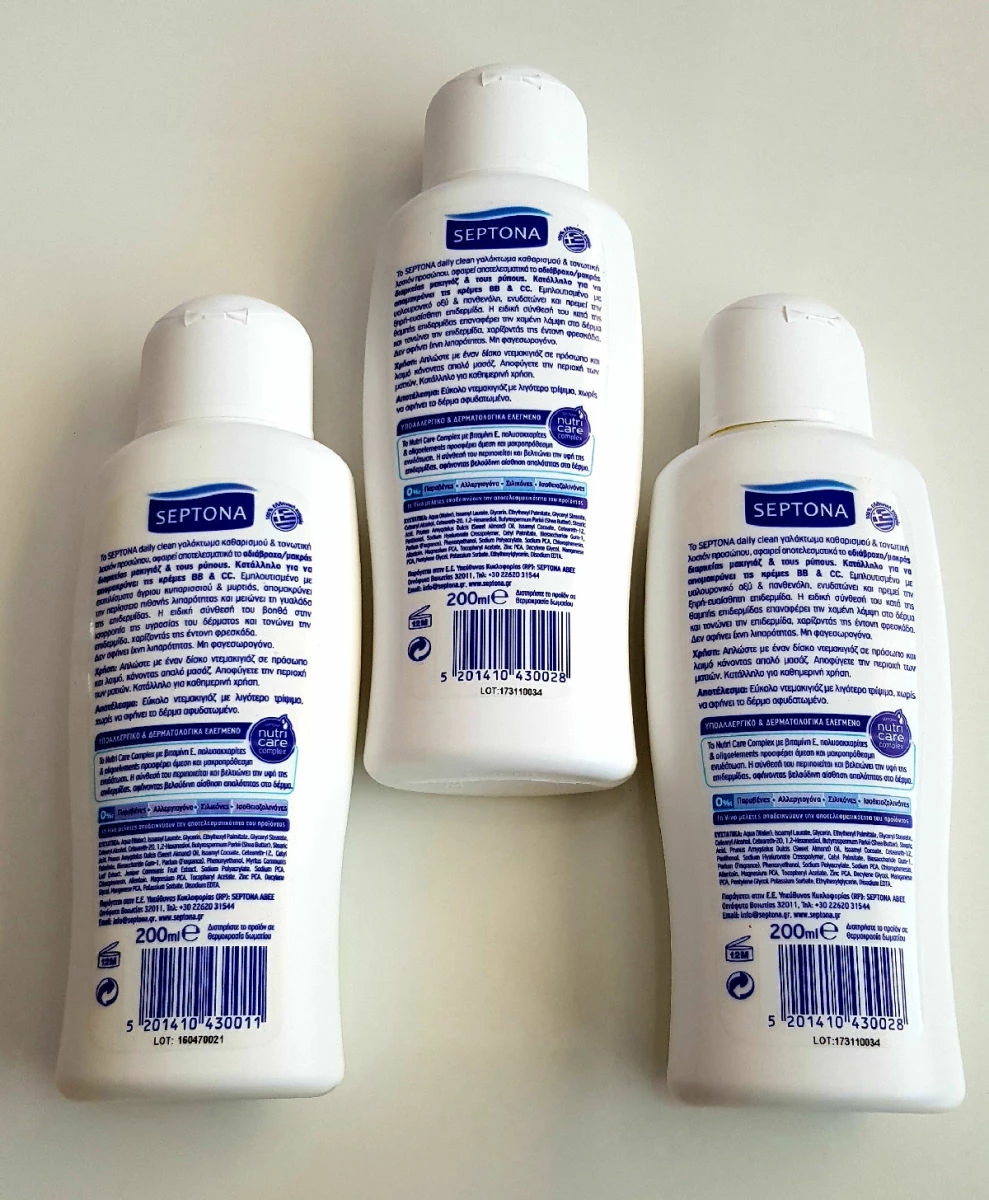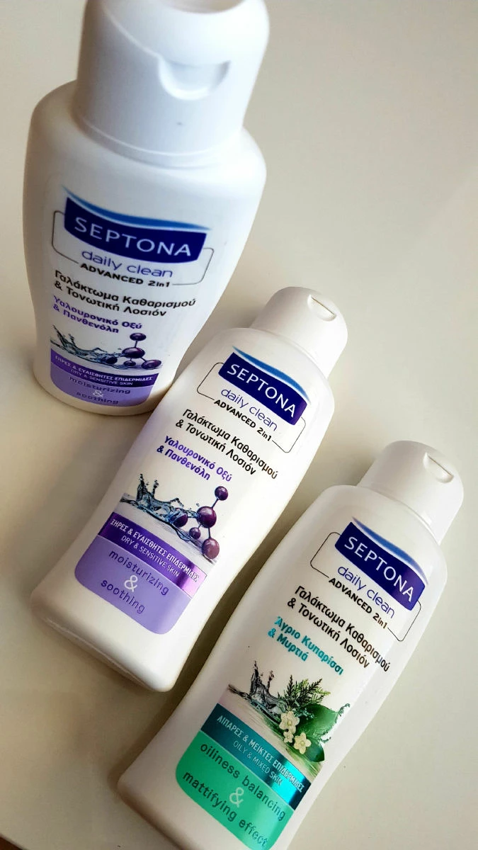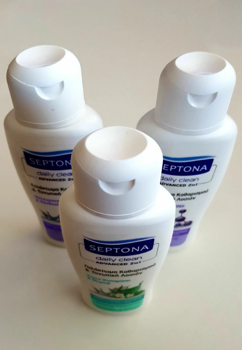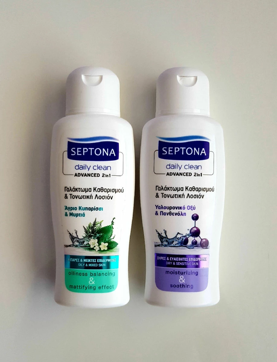 Το SEPTONA daily clean γαλάκτωμα & τονωτική λοσιόν καθαρισμού προσώπου, αφαιρεί αποτελεσματικά το αδιάβροχο/μακράς διαρκείας μακιγιάζ & τους ρύπους.