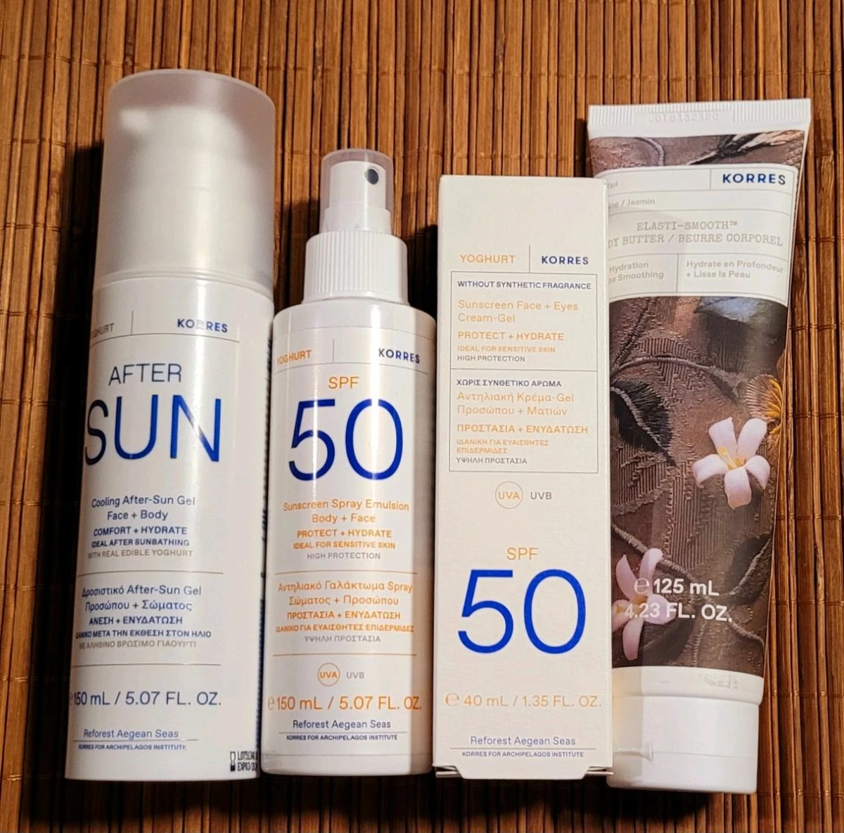 Κορρές after sun gel προσώπου και σώματος-λήγει 03/2024. αντηλιακό γαλάκτωμα spray σώματος και προσώπου 50 spf. λήγει 02/2024. αντηλιακή κρεμα προσώπου και ματιών 50 spf- λήγει 09/2023. body butter με άρωμα γιασεμί 125ml. όλα είναι αχρησιμοποιητα!