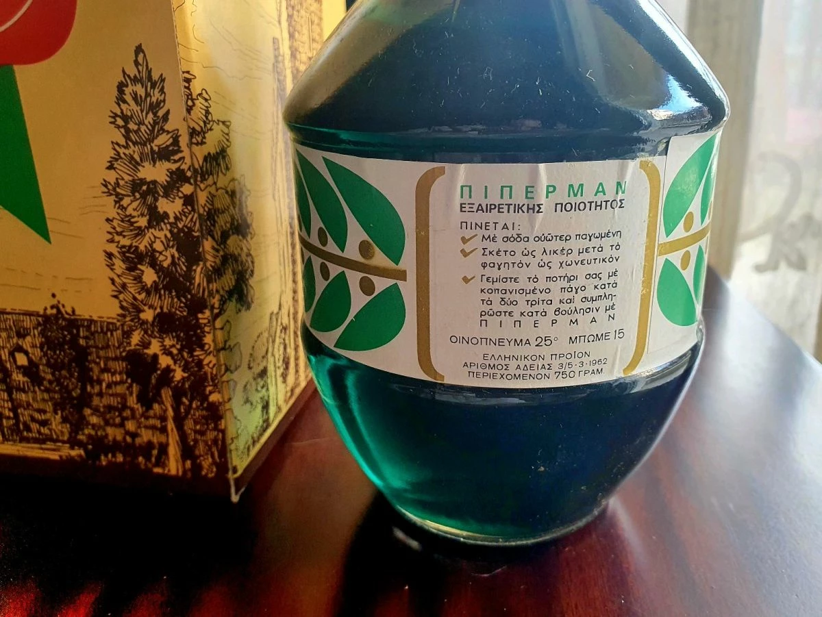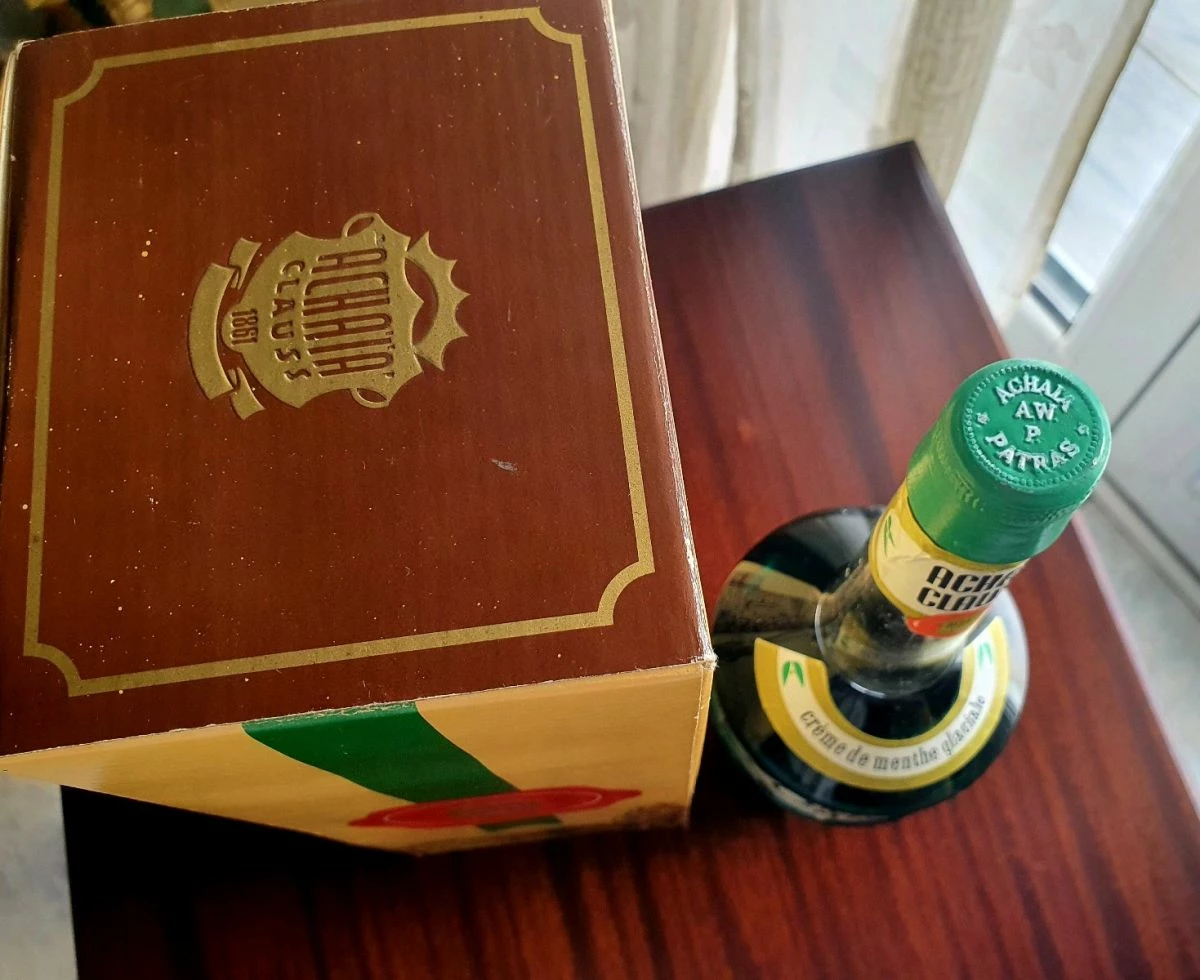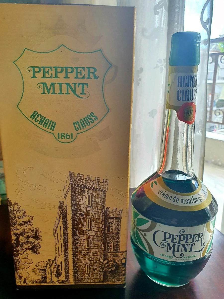 Μπουκάλι Συλλεκτικό Αντίκα “Pepper Mint – Achata Clauss” σφραγισμένο σε πολύ όμορφο χρώμα ποτού μέντας, μαζί με το κουτί του. Για συλλέκτες ή διακόσμηση.