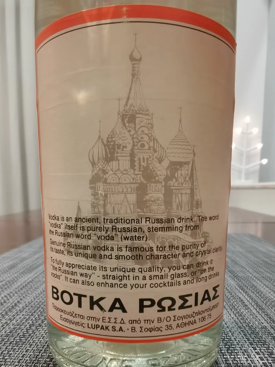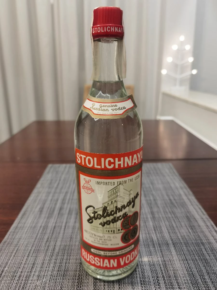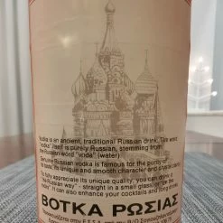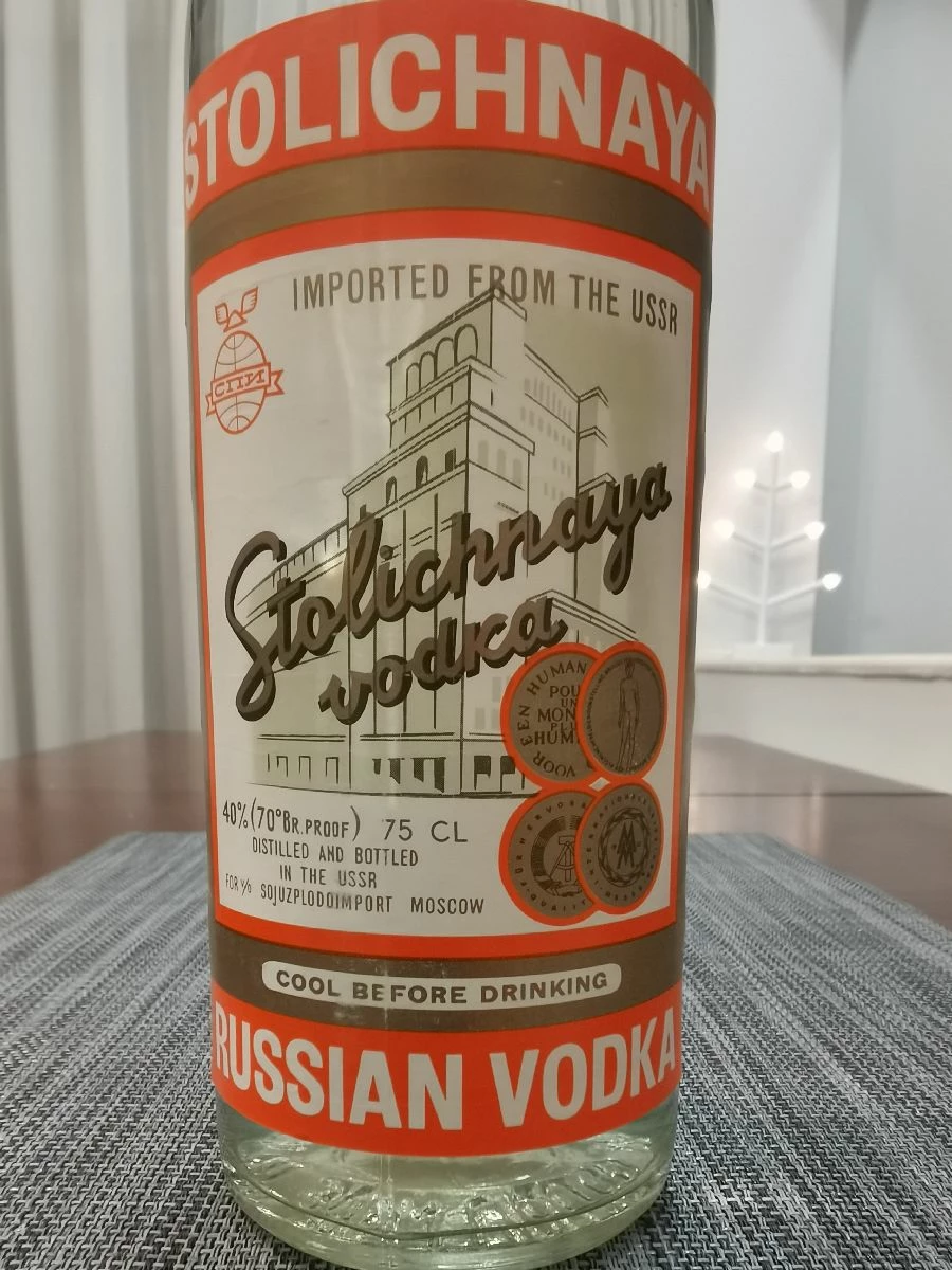 Αυθεντκή βότκα Ρωσίας, παρασκευής και εμφιάλωσης στην πρωην σοβιετική ένωση (Ε.Σ.Σ.Δ.). Η φιάλη είναι σφραγισμένη, με την ταινία ελέγχου, σε άριστη καταστασή.