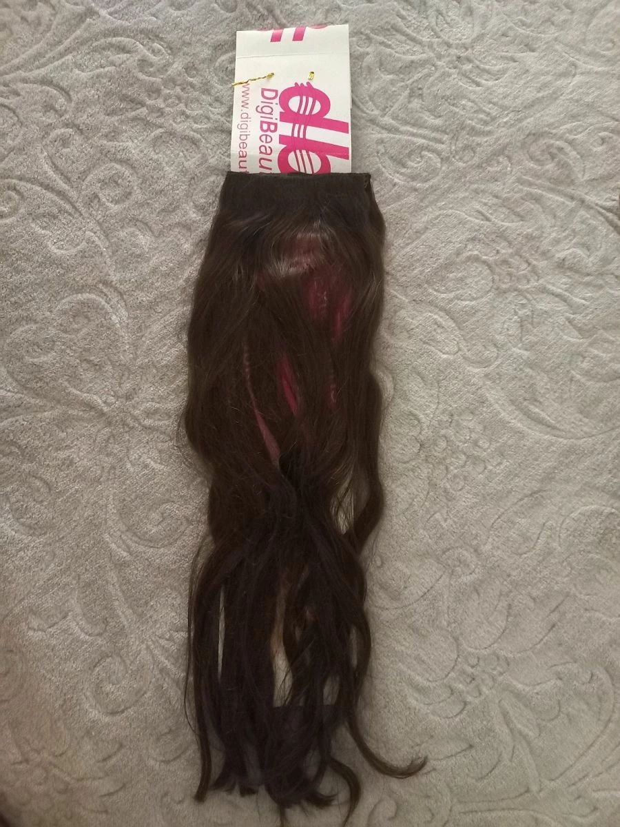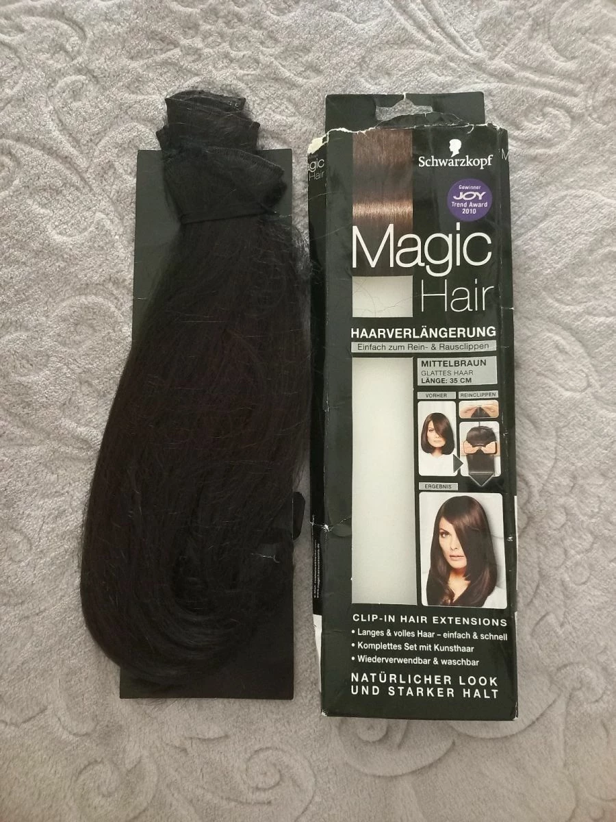Τρέσα μαλλιών, Schwarzkopf magic hair, χρώμα καστανο, μια σειρά κλιπς και τρίχα συνθετική, αγορασμένη από τα Hondos Center 40 ευρώ.
